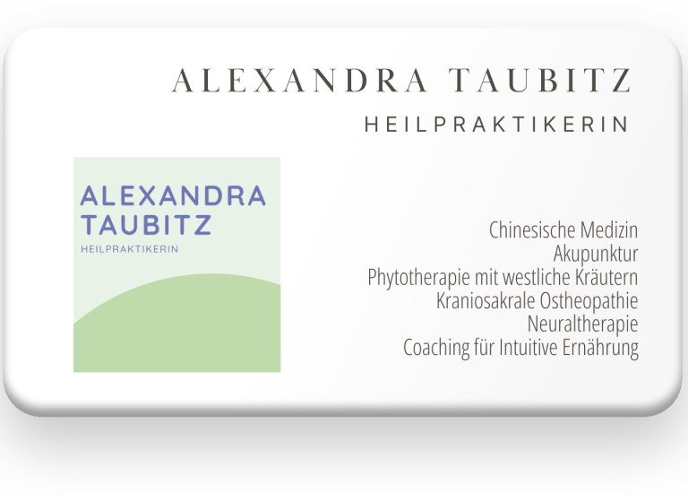 Alexandra Taubitz verbindet fundierte komplementärmedizinische Verfahren mit jahrtausendealtem Wissen der Chinesischen Medizin. Ihre Behandlungsschwerpunkte umfassen Akupunktur, Phytotherapie mit westlichen Kräutern, Kraniosakrale Osteopathie sowie Neuraltherapie.